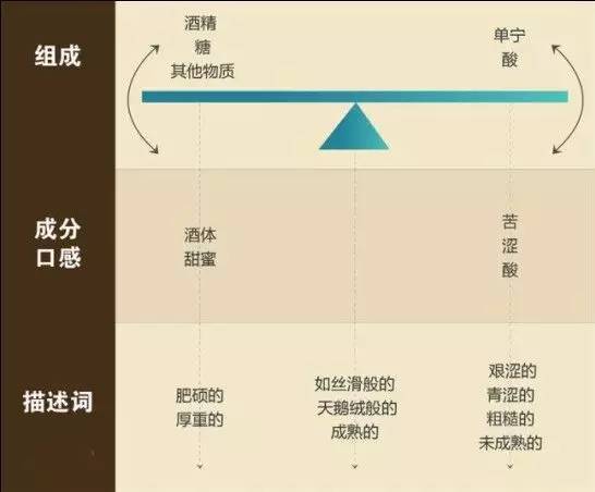 葡萄汁里的糖類在發酵過程中會產生酒精,從而提升葡萄酒的酒精度。我們也可以從這個維度根據酒精度從低到稿將葡萄酒的口感描述分類:清瘦,輕盈,健壯,強勁,酒氣刺鼻,酒精度過高。對于一些帶有殘糖的葡萄酒,甚至是高殘糖的甜酒,殘糖的濃度的高低會和酒精度帶來類似的口感影響。