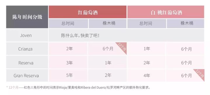 陳年時間的分級體系主要存在于里奧哈、杜埃羅河岸和納瓦拉等法定產區,且適用于DO或DOCa葡萄酒,從低到高依次為: