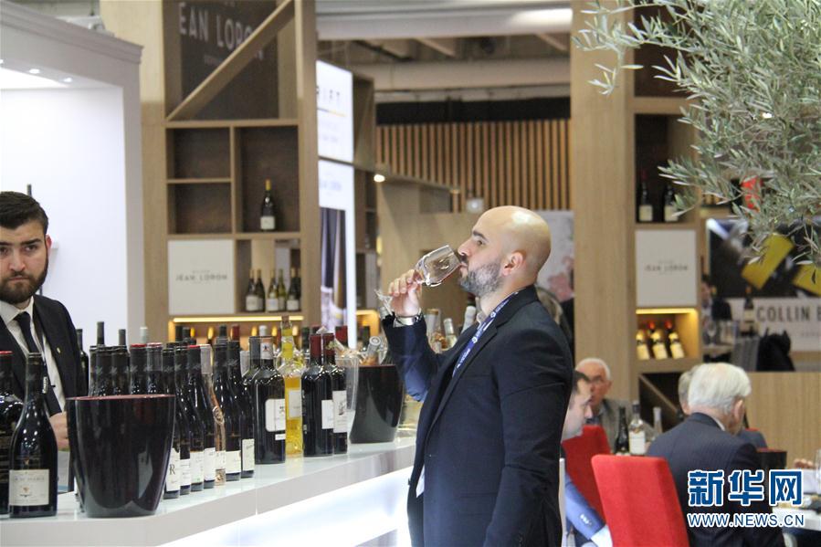 2月12日,在法國巴黎國際葡萄酒及烈酒博覽會上,一名男子品嘗紅酒。 新華社記者 徐永春 攝