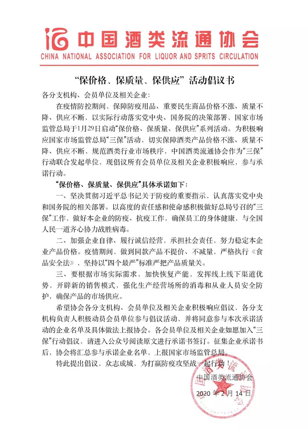 經濟日報-中國經濟網北京2月17日訊 為積極響應國家市場監管總局于1月29日啟動“保價格、保質量、保供應”系列活動,中國酒類流通協會2月14日向所有會員單位及相關企業發出參加“三保”行動倡議。至 2月17日中午,共有403家酒類企業積極報名參與“三保”行動并做承諾。