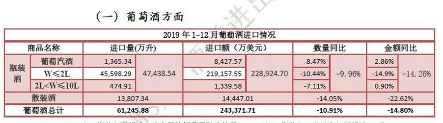2019年1-12月,葡萄酒進口量6.1億升,同比下降10.9%,進口額24.3億美元,同比下降14.8%。圖/