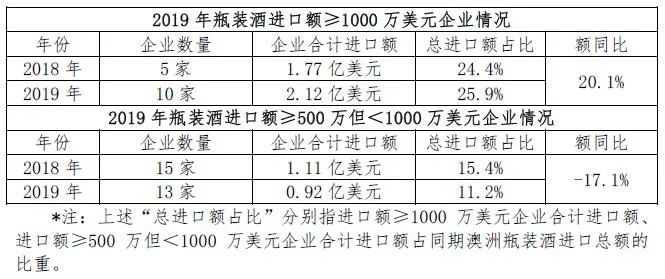近兩年,頭部企業對澳洲酒的持續加碼對進口葡萄酒市場格局起到了頭雁效應。澳洲瓶裝酒進口頭部企業(指進口額≥500萬美元以上的企業)隊伍有所壯大,且進口額呈正向增長(5.6%):其中,2019年進口額≥1000萬美元的10家企業中9家實現同比增長,僅1家同比下降;進口額≥500萬美元的13家企業中9家實現同比增長,4家同比下降。