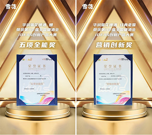 3月25日,第112屆全國糖酒會IDEAS創新產品大賽舉行頒獎儀式。本次比賽聚焦“產品創新組、包裝設計組、舌尖美味組、營養健康組、營銷創新組”五大核心賽道。最終,在160余個品牌、390多款產品的競爭中,雪花啤酒(經典老雪)憑借其卓越的營銷洞察力摘得“營銷創新獎”,而雪花啤酒的超高端產品“醴”,以其綜合實力斬獲全場最.高榮譽 “五項全能獎”。