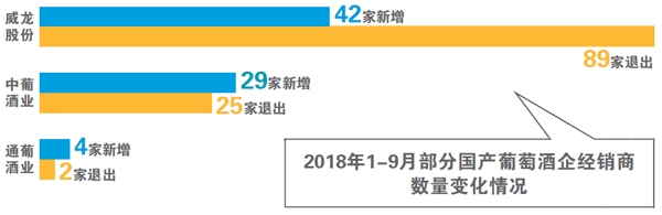 中信國安葡萄酒業(yè)股份在2018年1-9月新增經(jīng)銷商29家,退出經(jīng)銷商25家,較2017年年末微增4家。此外,中信國安葡萄酒業(yè)股份包含團購在內(nèi)的直銷渠道銷售收入下跌了43.42%,批發(fā)代理及經(jīng)銷商渠道的銷售收入則下跌了9.57%;通化葡萄酒股份的表現(xiàn)同樣不容樂觀,年末經(jīng)銷商數(shù)量較2017年年末僅增加兩家,而從銷售收入上看,含團購的直銷渠道銷售收入大幅下滑38.05%,批發(fā)代理渠道銷售收入則大幅下滑30.79%。